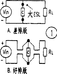图l显示了在一个PCB上输人电源至的不同走线方式。为了降低滤波电容器的ESL,电容器引脚的引线长度虚尽最减短。而Vin正极至Rl和Vin负极至RL的走线应尽量靠近。