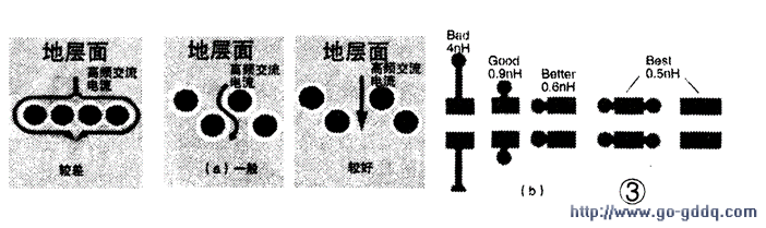5.许多设计人员喜欢在多层PCB上放置很多过孔,但是必须避免在高频交流电流返山路径上放鼹过多过孔,否则,地层上高频交流电流走线会遭到破坏。如果必须在豳频交流电流路径上放置一些过孔的话,过孔之间可以留出一些空间让高频交流电流顺利通过。图3(a)显示了过孔放置方式。