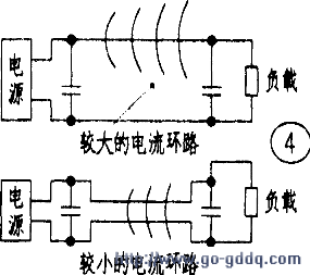 6.许多开关电源的负载远离电源的输出端口,为了避免输出走线受到电源自身或周边电千器件所产生的电磁波干扰,输出电源走线必须像罔4中那样靠得很近。输出电流坏路的面积也必须减小。
