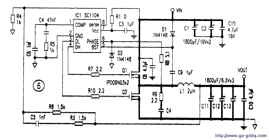上端场效应管(Q)的源极、下端场效应管(Q2)的漏极和输出电感(L)之间的连接点是一整块锏片焊盘。由于该连接点上的电压是高频和交流,Q1和Q2和L需要靠得非常近。虽然输出滤波电感(L)和输出滤波电容(Cout)之间的走线上没有高峰值的高频交流电流,但比较宽的走线可以降低直流阻抗的损耗使电源的效率得到提高。如果成本上允许,电源可用一面完全是接地层的双面PCB.但必须注意在地屡上尽最避免走功率和信号线。同时在电源的输入和输出端口还各增加一个瓷片电容器来改善电源的高频滤波性。