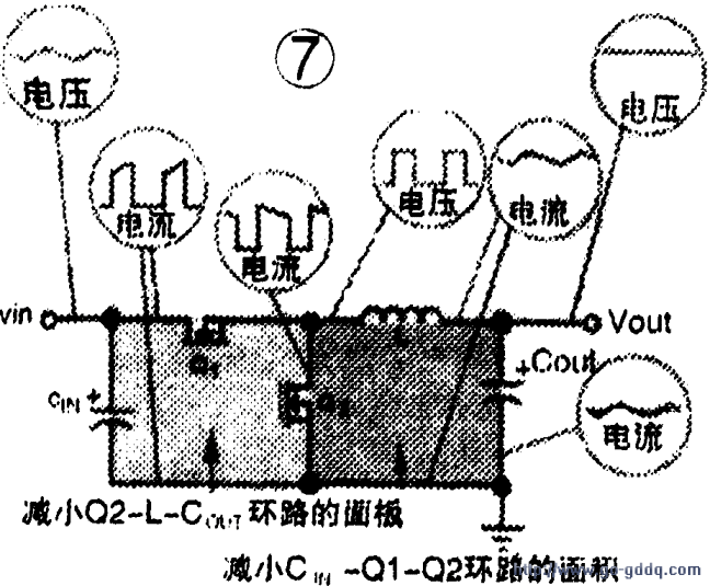 1.电源功率电路PCB排版电源功率器件在,PCB上正确的放置和走线将决定整个电源工作是否正常。图7更进一步显示一个降压式拜关电源功率电路元器件上的电流和波形。由于从输入滤波电容(Cin)上端场效应管(Q1)和下端场效应管(Q2)中所流过的电流是带有高频率和高峰值的交流电流。所以由Cin-Q1-Q2所形成的环路面积要尽量减小。同时由下端场效应管(Q2)、电感(L)和输出滤波电容(Cout)所组成的环路面积也需要尽量减小。