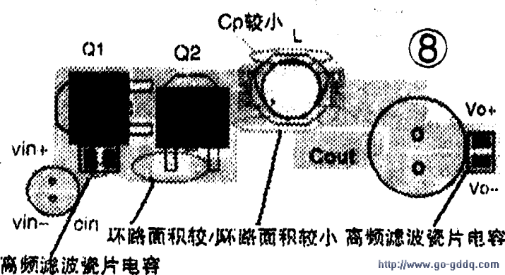 图8是一个比较好的电源功率电路PCB走线。Cin-Ql-Q2和Q2-L-Cout环路的面积已控制得最小。