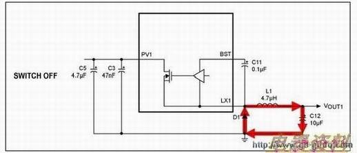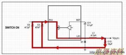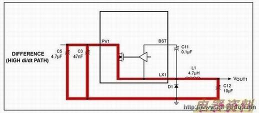 MAX16922的开关调节器是器件的最大辐射源。为了降低辐射,开关调节器的无源元件布线非常关键。存在电流阶跃的通路可看作是交流电流通路,将在开关的通、断内有电流流过的通路去掉,即得到交流电流通路。可以把在开关的通、断周期内有电流流过的通路看作直流电流通路。
