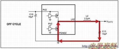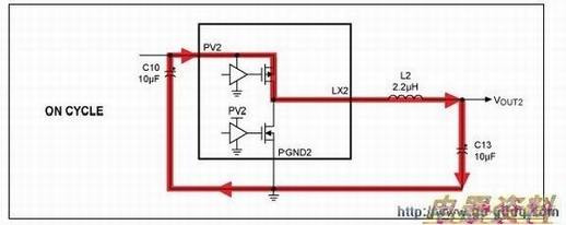 同步整流DC-DC转换器(OUT2)具有三个无源元件(C10、C13和L2),直接连接在开关电流通路。与OUT1类似,这三个元件对OUT2的辐射和性能有很大影响。图4和图5所示为开关通、断期间的电流通路。图6所示为两个电流通路的过度,即最高di/dt。优化元件C10的布线对于提高性能最为重要,其次是L2和C13。