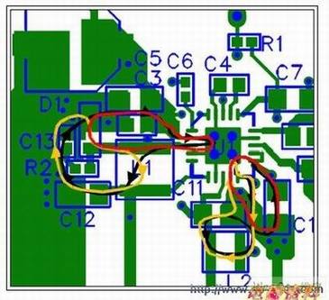 1.OUT1:尽量减小输入(C1)、 (L1)、 (D1)和输出(C2)的环路面积。