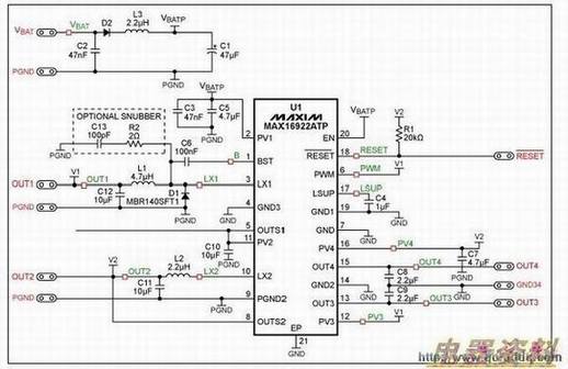 DC-DC转换器(OUT1)采用一个高边DMOS器件,它需要一个比LX1引脚(DMOS的源极)高出5V的电源。为了产生这个电压,采用一个自举电容连接到LX1和BST之间(图7)。DMOS关断期间,自举电容(C4)由5V LSUP 稳压器 充电。LSUP输出还用于误差放大器供电。因此,须尽可能保持一个低噪的LSUP电源,以消除噪声对误差放大器的负面影响。最好的办法是降低C4与MAX16922之间的引线电感。将C4尽可能靠近第19引脚(GND)和第17引脚(LSUP)放置,不要使用任何过孔。