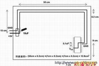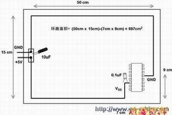 此电路板上,设计出的环路面积为697cm2。采用图3所示的方法,电路板上或电路板外的辐射噪声在环路中感应电压的可能性可大为降低。