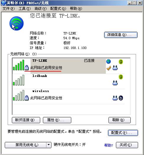 如果您的电脑无线网卡支持WPA/WPA2 ,我们推荐您采用WPA/WPA2的方式进行加密连接,因为WPA/WPA2相比WEP方式来说在安全性上更高!本例中配置迅驰无线网卡采用了Intel提供的Intel PROSet这款配置程序(同时关闭了Windows自带的无线网络配置程序),我们推荐使用这款配置程序来管理无线网卡,而不推荐Windows操作系统自带的无线网络配置程序,因为相比之下Windows系统自带的无线配置程序功能有限。