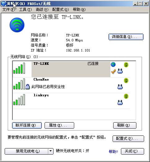 3、无线功能打开后,迅驰网卡会自动扫描周围可用的无线网络,并且会自动连接其中一个可用的网络。如下图所示,网卡在周围环境搜索到三个无线网络,作为笔记本使用者我想让自己的笔记本连接到某个无线网络中,比如我想连接SSID为TP-LINK的那台无线路由器,那么我只要点击图标选中TP-LINK,然后点击下面的“连接”按钮,笔记本的无线网卡就会连接上SSID为TP-LINK的那台AP了。如下图所示有已连接的字样显示。此时网卡从TP-LINK无线路由器动态获取了IP地址为192.168.1.101 。如果想要笔记本下次开机直接连接SSID是TP-LINK的无线路由器,也可以把目前已连接的网络设置为首选网络,下次开机时就可以直接连接这个路由器了。