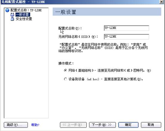 3、如下图所示,选择左列菜单“一般设置”,在右面配置相应的参数:“配置式名称”可以任意输入,这里填TP-LINK,但“无线网络名称(SSID)”一定要填写准备连接的无线路由器的SSID,本例中必须填写为TP-LINK ,这个参数是由无线路由器决定而非无线网卡决定。下面的操作模式选择默认的“网络(基础结构)-连接至无线网络和(或)因特网”即可。