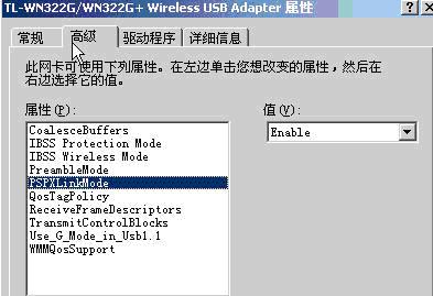 首先安装好WN322G+无线网卡的驱动和客户端软件,然后打开设备管理器-网络适配器,在TL-WN322G/WN322G+ wireless USB Adapter上右键点属性,然后打开高级选项卡,一定要把PSPXLinkMode改为Enable,默认是Disable,否则PSP连接不成功。