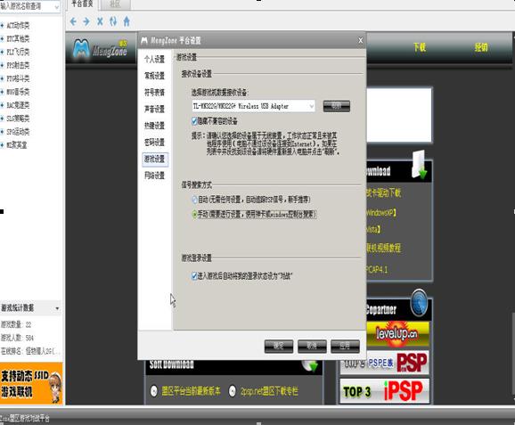 对战平台有很多,有国外的还有国产的,本例以国产的盟区对战平台为例,首先进入http://www.mengzone.com/网站,免费注册一个用户名和昵称,昵称就是你在游戏中的名字。然后下载游戏平台客户端软件,在本机上安装好。打开桌面上的客户端,输入刚注册的用户名和密码,然后选择登录服务器,确定后就进入了游戏主界面,在首页中点击游戏设置,在接收设备设置上选择我们安装的无线网卡(TL-WN322G/WN322G+ wireless USB Adapter)。