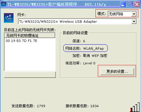 1)先将TL-WN322G客户端应用程序主截面中“模式”下拉框选择为:无线网络。