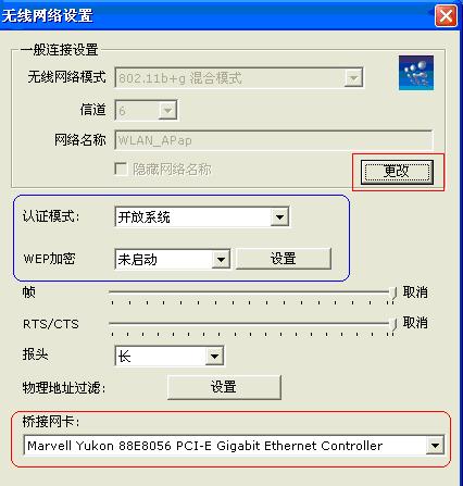 3)选择桥接网卡,桥接到另外一块能够正常上网的Marvell有线网卡。这样PSP只要连接上WN322G+,就能够上网冲浪,无需其他设置。