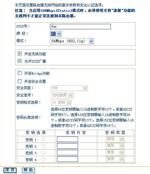 如上图,配置SSID号为fae;频段为6;模式为54M(802.11g);开启无线功能;不勾选开启安全设置。