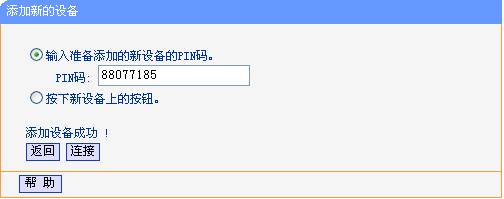 4. 选择输入准备添加的新设备的PIN码,填上无线网卡的PIN码,点击连接按钮。如果连接成功,无线路由器该界面上会显示添加新设备成功。
