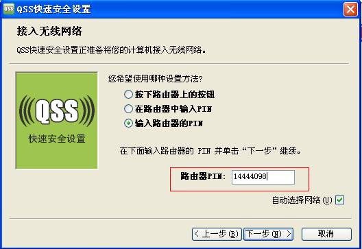 3. 在随后出现的界面中选择第三项,填写路由器的PIN码,单击下一步按钮。