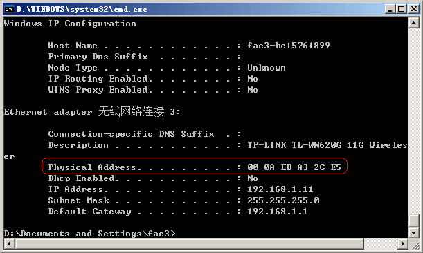 顺便说一下怎样获取网卡MAC地址?可以参考我司网站“网络教室” 文档《路由器配置指南》相关内容,通过电脑DOS界面运行ipconfig/all这个命令会弹出如下类似信息,红线勾勒部分“Physical Address”对应的就是处于连接状态的网卡的MAC地址;