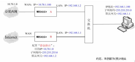 在一个公司网络中,不仅可以通过无线路由器B连接外网,还可以通过无线路由器A来连接公司内网服务器。在不修改本地连接的IP地址及网关情况下,公司电脑需要能够同时访问外网和内网服务器。配置实例如下图: