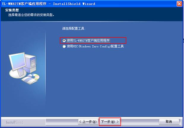 选择安装网卡配置工具。如果您希望通过TP-LINK配置工具进行配置,请选择第一项,如果您希望通过Windows自带的配置工具进行配置,请选择第二项。这里选择第一项,点击下一步继续。