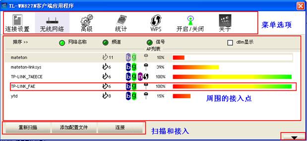 直接连接就是在扫描到的接入点中单击选中要连接的接入点,然后点击连接来接入到接入点(如果接入点不在列表中,可通过单击重新扫描刷新列表)。
