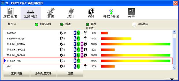 连接到接入点时,又分两种情况:一种是接入点没有设置无线安全,另一种是接入点设置了无线安全。下面以接入“TP-LINK_FAE”为例进行描述。