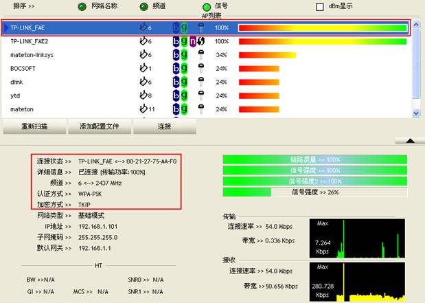 点击应用,网卡就会自动连接到“TP-LINK_FAE”这个接入点。连接成功后,点击无线网络,可以看见当前网络信息,在当前连接的网络SSID前会有一个蓝色的小三角标识。