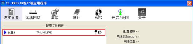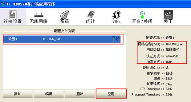 点击应用,网卡就会自动连接到“TP-LINK_FAE”这个接入点。连接成功后,配置文件前也会有蓝色的小三角。