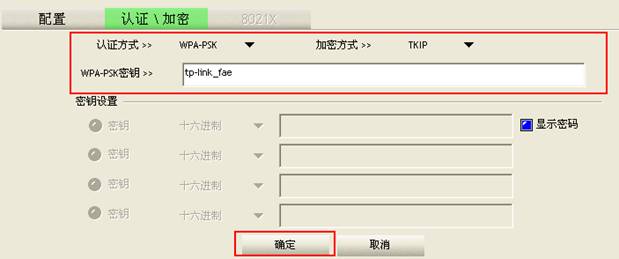 它的认证方式是:WPA-PSK;加密方式是:TKIP;密钥是:tp-link_fae。则TL-WN827N客户端的认证\加密要和接入点一样设置,如下图。