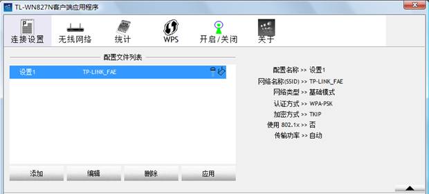这样以后每次只需要选中配置文件,然后点击应用,就可以连接到接入点了,省去了每次连接前的重复配置。