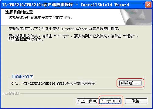 2) 安装程序提示您选择安装路径,默认安装路径为“C:\Program Files\TP-LINK\TL-WN321G_WN321G+客户端应用程序”,如果您想改变安装路径请点击“浏览”选择路径,我们建议您保持默认路径,点击下一步。