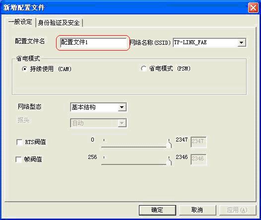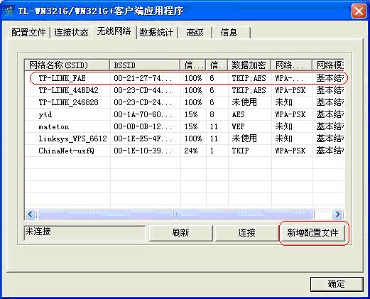 1) 点击无线网络,在扫描到的接入点中单击选中要连接的接入点,然后点击新增配置文件(如果接入点不在列表中,可通过单击重新扫描刷新列表)。下面以接入“TP-LINK_FAE”为例进行描述。