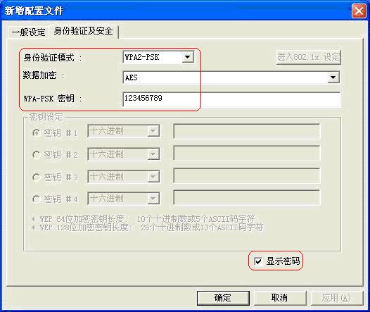 4) 如果您要连接的无线网络是启用安全的无线网络,身份验证模式、数据加密、密钥必须保持和接入点的设置一致,才能保证连接上接入点以及正常通信。