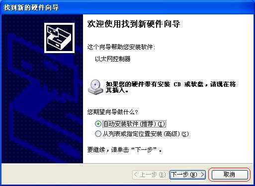 这里点击取消,在下面我们将通过光盘中的安装程序来安装驱动程序。