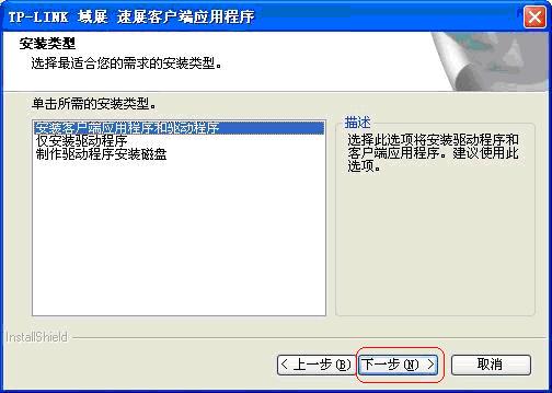 2) 选择安装类型,默认选择“安装客户端应用程序和驱动程序”;如果您选择“仅安装驱动程序”,安装程序会只安装驱动程序,不安装TP-LINK无线配置应用程序,您可以用系统自带的无线网络配置程序配置。我们建议您保持默认。