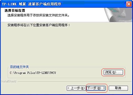 4) 安装程序提示您选择安装路径,默认安装路径为“C:\Program Files\TP-LINK\TWCU”,如果您想改变安装路径请点击“浏览”选择路径,我们建议您保持默认路径,点击下一步。