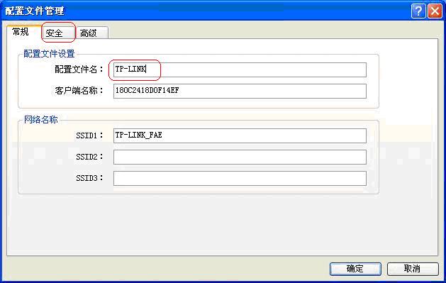 5) 知道前端无线路由器的配置后,需要在无线网卡端进行相应的无线加密设置。此时在配置文件管理中,配置文件名可以自由填写。SSID1需要与我们即将连接的无线信号“TP-LINK_FAE”一致