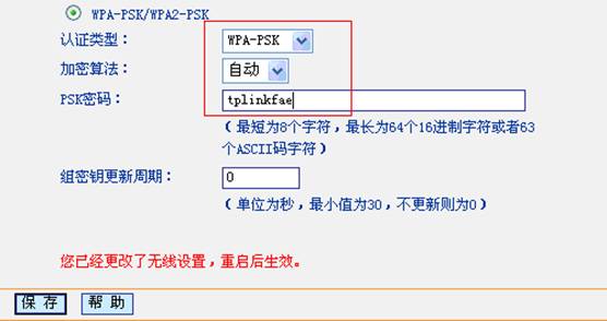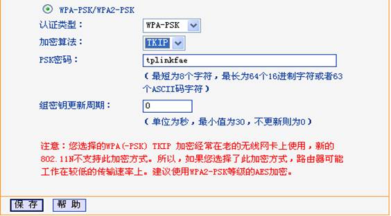 注意:若您手动选择TKIP,11N路由器会出现如下界面,意思是在此种加密模式下无线传输性能会下降,因此建议选择“自动选择或AES”。