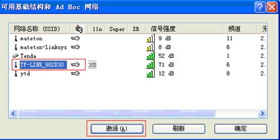 在上图中您可以看到网卡搜索到的无线信号,选中您自己路由器的无线信号,点击“激活” ,