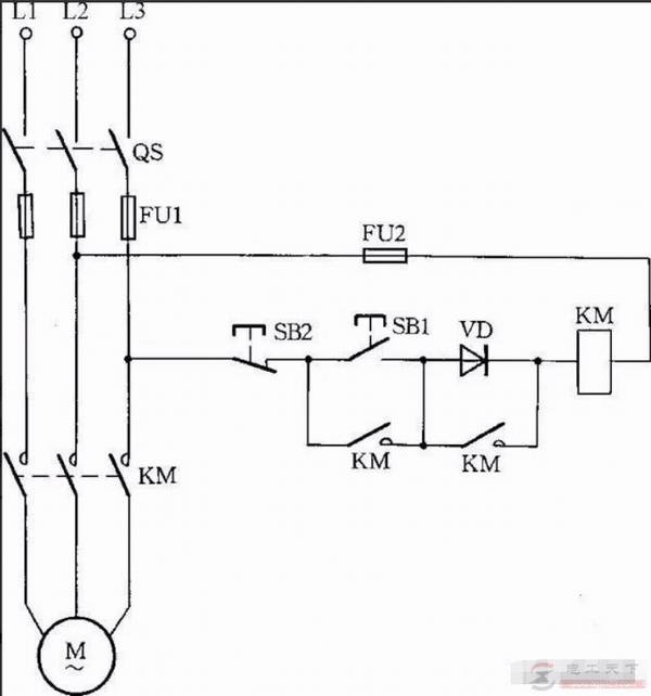 按下按钮SB1,经二极管VD半波整流的直流电压加在交流接触器KM线圈上,KM产生吸合,其辅助触点将二极管VD短接,交流接触器投入交流并运行。