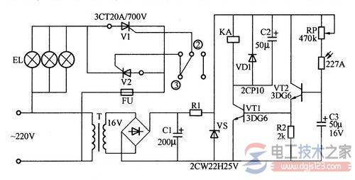 白天在较强光照下,光导管227A(一种光敏电阻)两端阻值很小,约20~50kΩ,晶体管VT2获得基极电流而导通,VT1从R2上得到正偏电压也导通,继电器线圈KA得电,继电器的常闭触电②、③断开,两只晶闸管V1和V2没有触发信号而不导通,因而灯泡EL不亮。