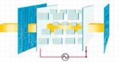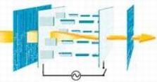 LCD正是由这样两个相互垂直的极化滤光器构成,所以在正常情况下应该阻断所有试图穿透的光线。但是,由于两个滤光器之间充满了扭曲液晶,所以在光线穿出第一个滤光器后,会被液晶分子扭转90度,最后从第二个滤光器中穿出。另一方面,若为液晶加一个电压,分子又会重新排列并完全平行,使光线不再扭转,所以正好被第二个滤光器挡住。总之,加电将光线阻断,不加电则使光线射出。(如图2)