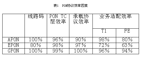 由于在PON系统中,光接口占系统成本的大头,其余系统元器件,如ASIC和其它标准件的价格也相差不大,故不管哪种PON系统,其系统本身的成本都比较接近。因此,在决定每比特成本或可从网络提取的“创收比特”数量时,效率就成了一个最重要的因素。假设系统的线路速率为1.25 Gb/s,那么 100%效率的网络将提供1.25 Gb/s的吞吐量,而50%效率的网络只能提供622 Mb/s的吞吐量,因此为了获得相同的吞吐量,后者的系统成本就要加倍。表1是不同PON效率的比较结果。比较时考虑了4个因素,即线路码、PON TC层或MAC层的效率、承载协议(ATM、以太网或GFP)效率和业务适配效率。应指出的是,在分析APON效率时,先分析APON在622 Mb/s时的情况,再推算到1.25 Gb/s时的效率,这是因为APON的标准只到622 Mb/s为止。