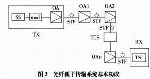 系统中的TX由超短脉冲半导体或饵光纤激光器、光调制器、信息源和光纤功率放大器所构成,用于产生光孤子脉冲信号;RX由宽带光接收机或频谱分析仪、误码仪与条纹相机所构成,用于测试系统传输特性或通信能力;STF由普通单模光纤或色散位移光纤(DSF)构成;OA~Oan由掺饵光纤放大器(EDFA)或半导体光放大器所组成,亦可由传输光纤本身的受激喇曼放大(SRA)或在传输光纤中掺入衡土饵元素构成的分布式饵光纤放大(DEDFA)系统来组成;TCS由导频滤波器、强度或相位光调制器、非线性元件和色散补偿光纤等组成,设置在沿传输系统不同的区域,用于克服或降低由放大器所带来的自发射(ASE)噪声和相邻孤子相互作用等对孤子通信容量的限制,提高孤子传输特性的稳定性。其中孤子光源、孤子放大以及对ASE噪声控制技术的选择已成为光孤子传输系统中核心的技术问题。
