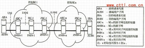 b)I-NNI接口为控制域内部接口,一般由单一供应商的设备组成。通常I-NNI接口不涉及互联互通,因此应允许协议实现的一些灵活性,比如允许厂家具有自己的保护恢复的实现。建议I-NNI接口信令协议可以选择PNNI、RSVP-TE、CR-LDP三种协议的任何一种。