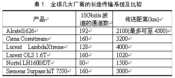 目前,超长途传输系统在码型技术、FEC技术、Raman放大器技术、色散补偿技术、孤子技术等方面都有所突破,延长了传输距离,可实现2000~4000km的无电中继传输,朗讯、阿尔卡特、北电等公司都纷纷推出了商用化产品。表1是全球几大设备厂商的长途传输系统及特性。