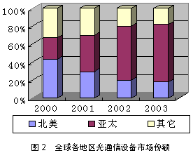 如图2所示,亚太地区是全球光通信设备市场最热的地区这是无可争议的事实,未来几年增长速度将稍有下降,但仍要高于全球其它地区。由于亚洲地区经济的强劲增长以及政策方面的原因,使得亚洲地区的电信能力有了很大的提高,今后几年亚洲仍是全球经济增长最快的地区,2004年亚洲的电信资本支出将增长5.9%,尤其是中国和印度增长最为突出。