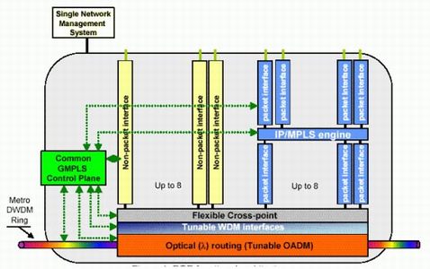 为了获得最大的弹性,人们便赋予了POE管理分组流量和电路流量的双重能力。分组流量通过IP/MPLS引擎来处理,而电路流量则被G.709转发器透明传送。介于DWDM系统和分组/无分组接口之间的弹性交叉点则提供网络保护功能以及完全弹性。每一个节点都可以根据不同情况配置分组接口(packet interfaces),非分组接口或者两种接口的混装接口。