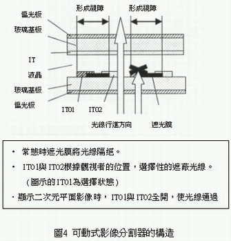 日本SANYO公司是最早从事有关三维立体影像技术的研究,早在94年曾推出不需专用眼镜的三维立体影像分割器,利用这种影像分割器可用来观赏立体动态影像,基本上它是根据视差障碍(parallax barrier)原理使影像交互排列先通过细长的纵列光栅后才由两眼捕捉观察,由于进入左、右眼的纵向影像因视差障碍器被分开,造成左、右眼所捕捉的影像产生微小偏离,最后经由视网膜当作三维影像读取(图1)。