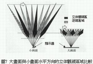 传统的不需专用眼镜的三维立体影像显示器,同样水平方向时小画面的前后方向的立体可视范围比大画面的立体可视范围大(图7),这是因为小画面的视角比较小,液晶显示器与影像分割器较不容易产生所谓的moire干涉缟。利用这种物理现象将液晶显示器与影像分割器,藉由电子方式分割成16等份各别掌控专属区域(图8)
